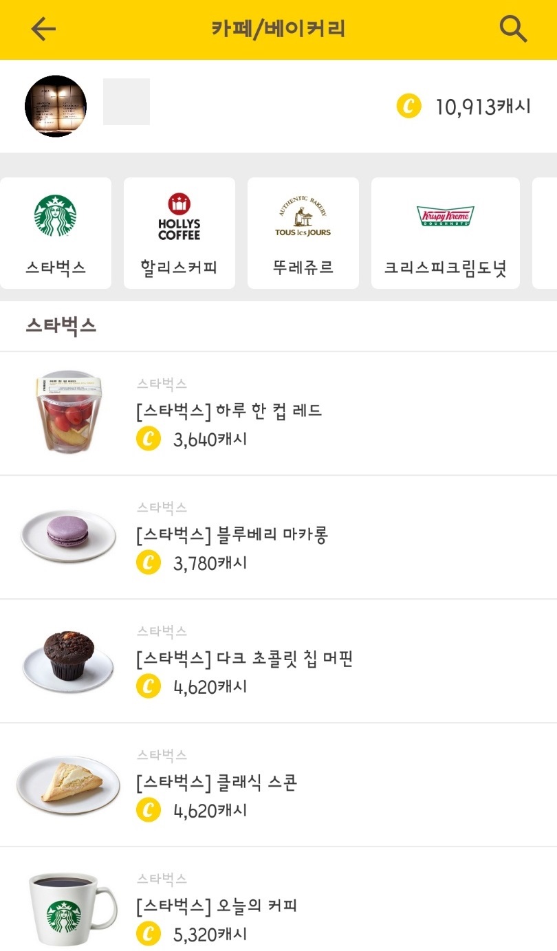 저는 주로 카페를 이용하는데요. 스타벅스, 이디아, 할리스, 뚜레쥬르, 크리스피크림도넛, 이디야, 스무디킹, 투썸플레이스 , 엔젤리너스의 커피숍을 캐시워크 포인트로 이용할 수 있으세요. 이렇게 가맹점이 많은 건 정말 장점인 것 같아요.