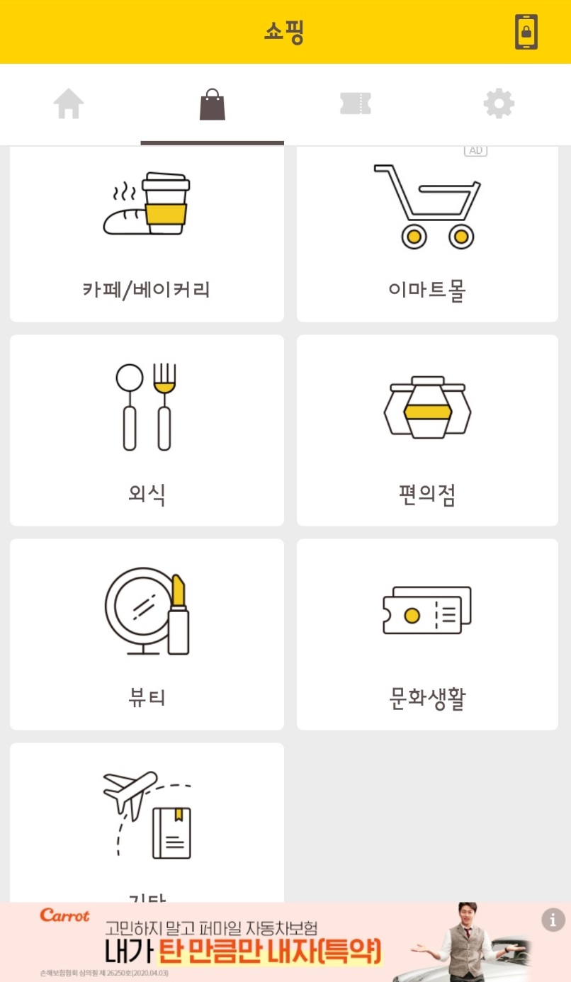 쇼핑카테고리에는 생각보다 다양한 품목이 있어요. 카페, 이마트몰, 뷰티, 외식, 편의점, 문화생활, 기타까지!! 많지요? 자신이 원하는 항목을 클릭하면 안에 있는 다양한 상품들을 확인하실 수 있으세요.